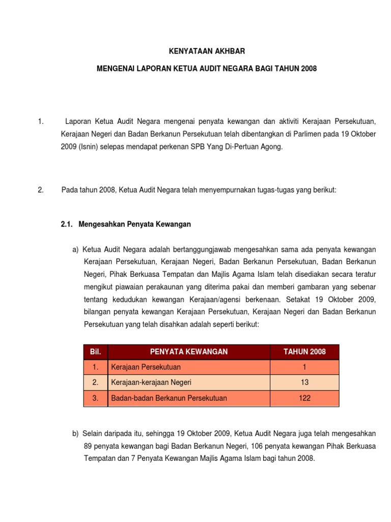 Kenyataan Akhbar Mengenai Laporan Ketua Audit Negara Bagi Tahun 2008